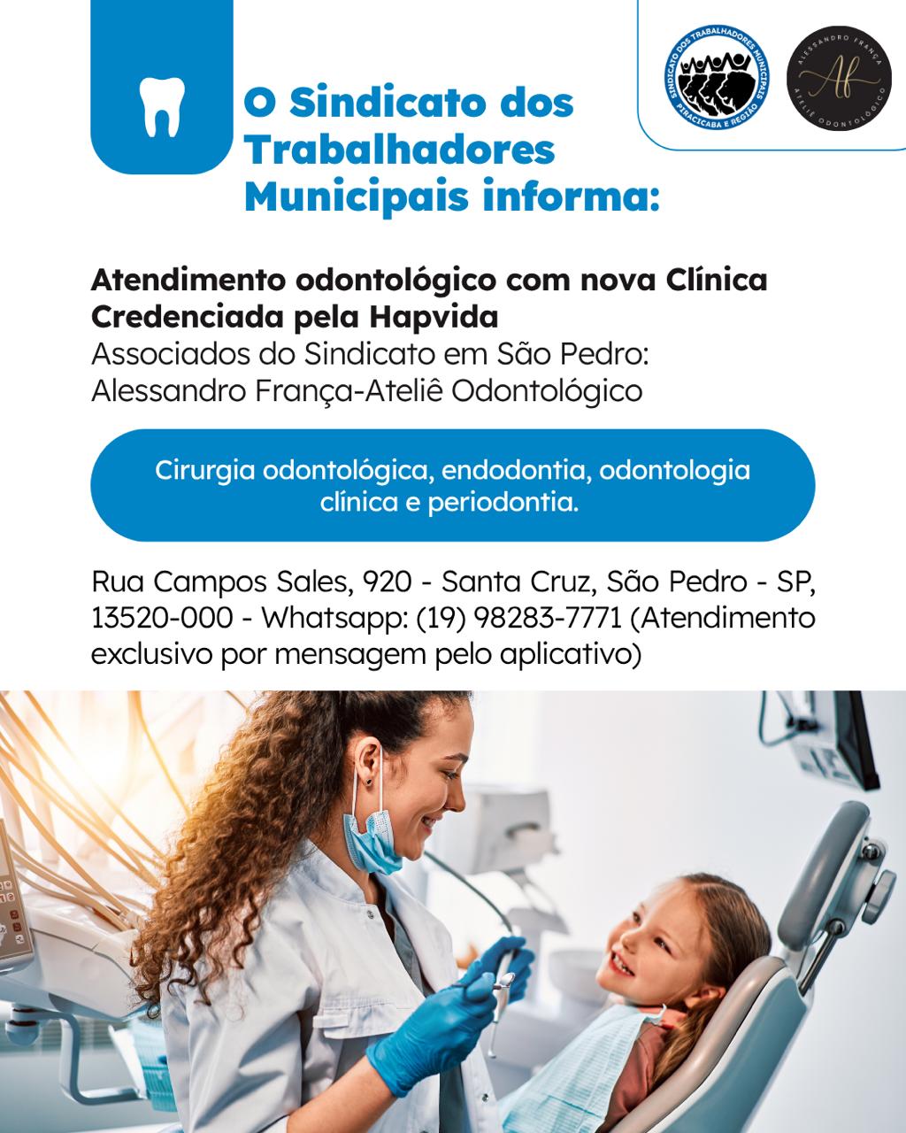 O Sindicato dos Trabalhadores Municipais de São Pedro informa aos associados a NOVA CLÍNICA ODONTOLÓGICA Credenciada pela Hapvida