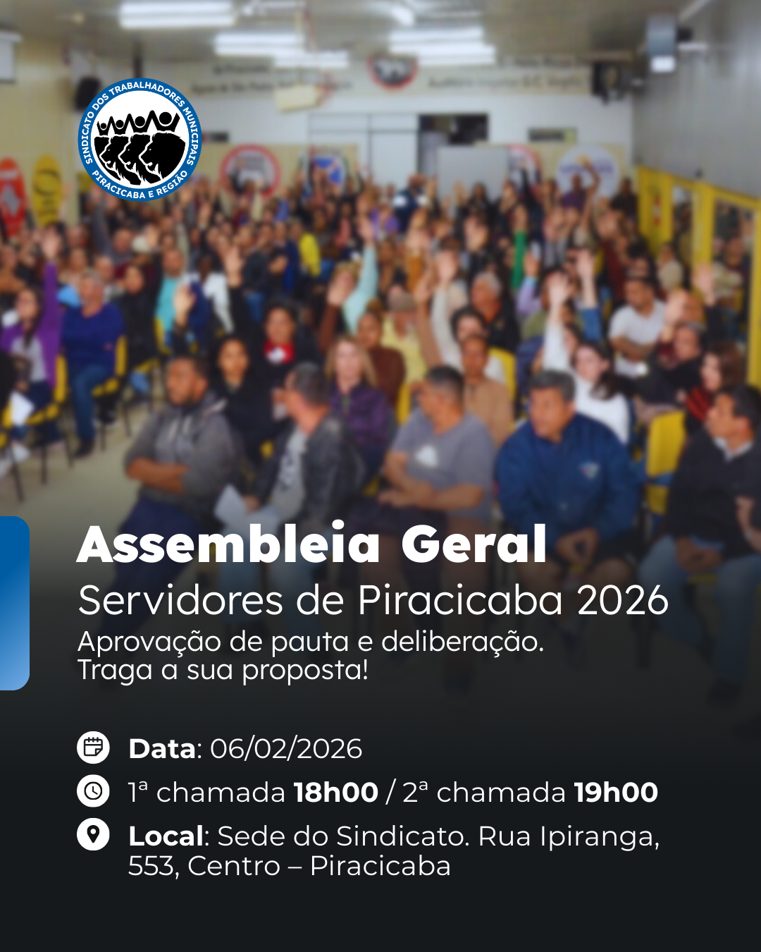 A assembleia Geral será no dia 06/02 (sexta-feira) no Sindicato dos Municipais