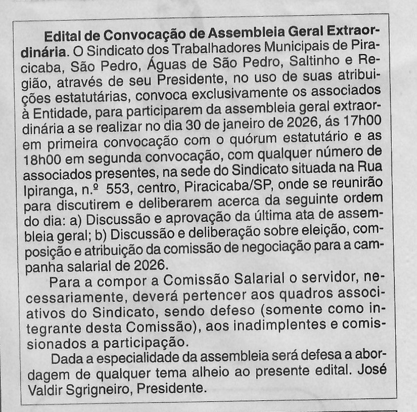 A diretoria do Sindicato dos Trabalhadores Municipais de Piracicaba e Região publicou, no dia 21 de janeiro, edital convocando os asso [...]